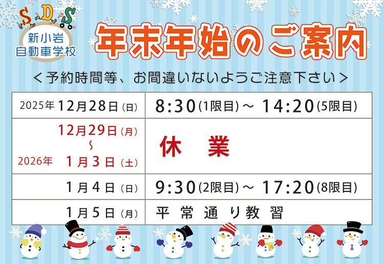 ![]() 【送迎バスのお知らせ】2025年12月4日から暫くの間、新小岩便を減便させていただきます。ご利用の方はご確認の程よろしくお願いします。 ![]() 【入所後の教習の進め方】入所後の教習の進め方のご案内です。先行学科1・適性検査を受講する前に動画をご視聴ください。 ![]() 【2023年5月8日以降の新型コロナウイルス感染防止対策について】 2023年5月8日からは、新型コロナウイルス感染症の感染法上の位置づけが「新型インフルエンザ等感染症」から「5類感染症」に変更されます。これに伴い、当校における感染防止対策は、下記の通りといたします。マスクの着用については、個人の判断に委ねることを基本といたします。 ●技能教習及び技能検定時(四輪車) ※四輪の教習車に乗車する場合は、引き続きマスクの着用をお願いいたします。 〇換気のため、エアコンを使用していても随時、窓の開閉を行います。 メニュー